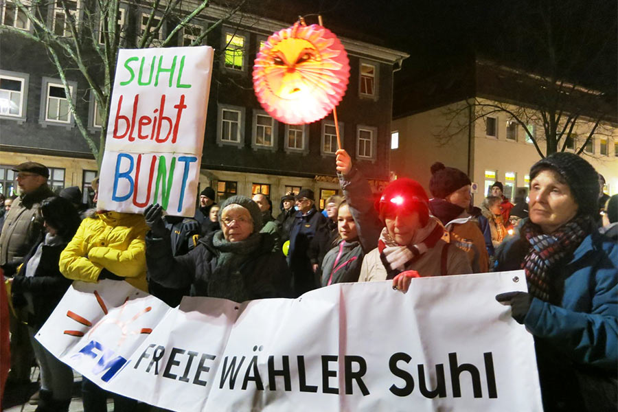 Deshalb ist es für unsere Fraktion und viele Mitglieder unseres Vereins ein Gebot der Zeit, gemeinsam mit Familien, Freunden, Bekannten oder Nachbarn und Gleichgesinnten montags um 18 Uhr auf dem Suhler Marktplatz zu stehen, um Signale zu setzen, dass wir die demokratische, bunte, tolerante und weltoffene Kultur in Suhl nicht von Neonazis verunglimpfen lassen. Natürlich gefällt auch uns nicht jeder Passus in jeder Rede, aber in einem Lande, in dem Meinungsfreiheit ein Grundrecht ist, muss man auch andere Meinungen aushalten solange sie nicht an den Grundpfeilern unserer Demokratie rütteln.