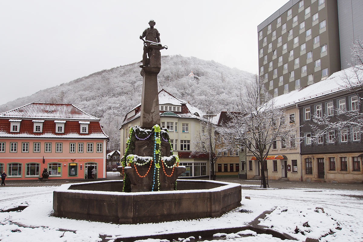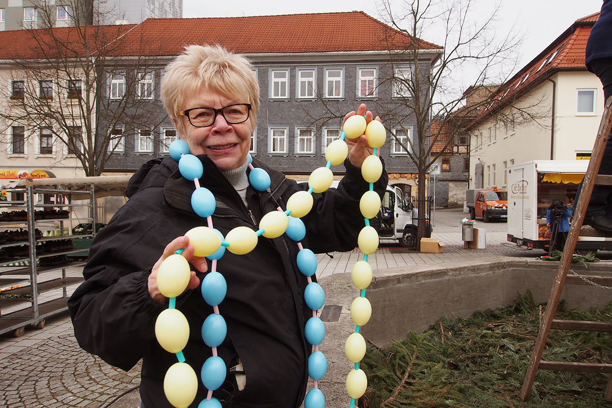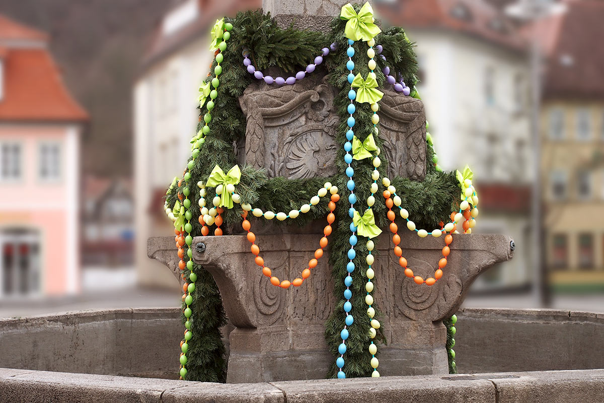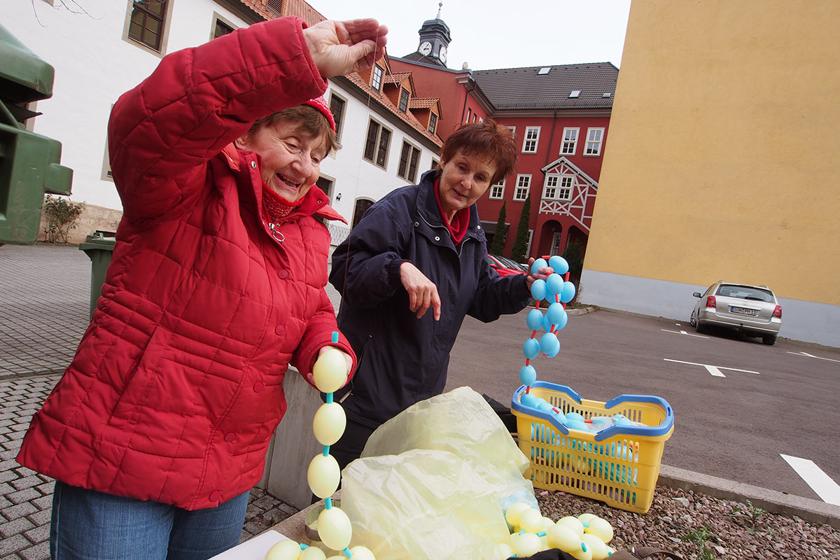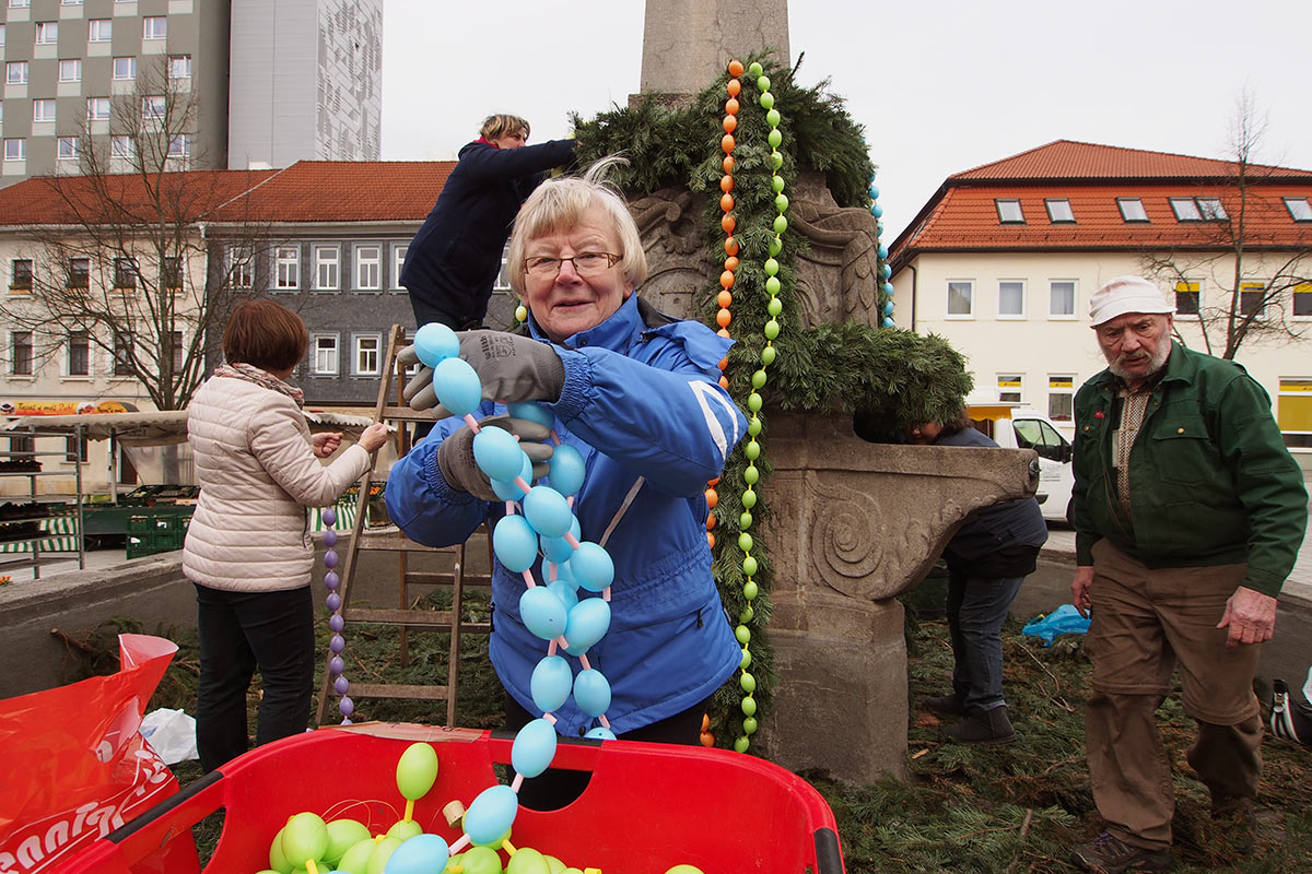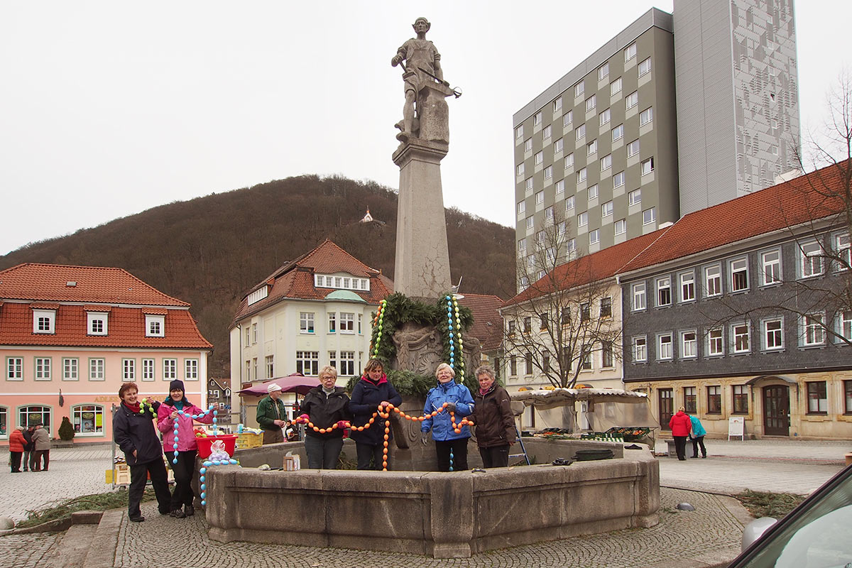 Kurz vor Ostern hatten Vandalen gewütet und die Ostereierketten vom geschmückten Brunnen gerissen. Und nicht nur das: Viele Eier hatten die "Hirnlosen" im Brunnenbecken mutwillig zertrampelt. Wir standen also vor der Frage: Abbau oder Sanierung. Wir entschieden uns für die Rekonstruktion - besorgten neues Material und opferten noch einmal unsere Zeit. Aber das Ergebnis konnte sich dann doch wieder sehen lassen: Der Waffenschmiedbrunnen war wieder österlich geschmückt.