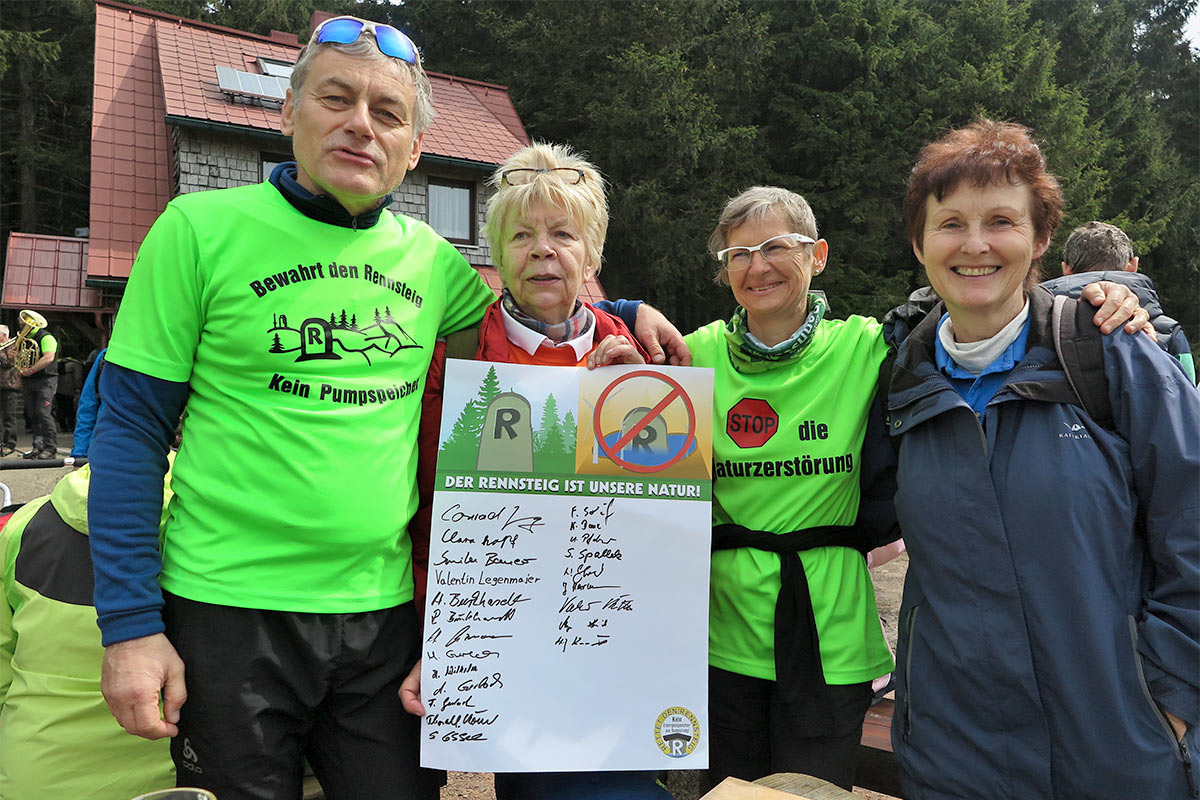 Unterschriften gegen den gigantischen Pumpspeicher am Rennsteig: Rainer Partschefeld, Ingrid Ehrhardt und Brigitte Günkel von den Freien Wählern Oberhof und Suhl gemeinsam mit Sylvia Kössel vom Vorstand der Bürgerinititiative.