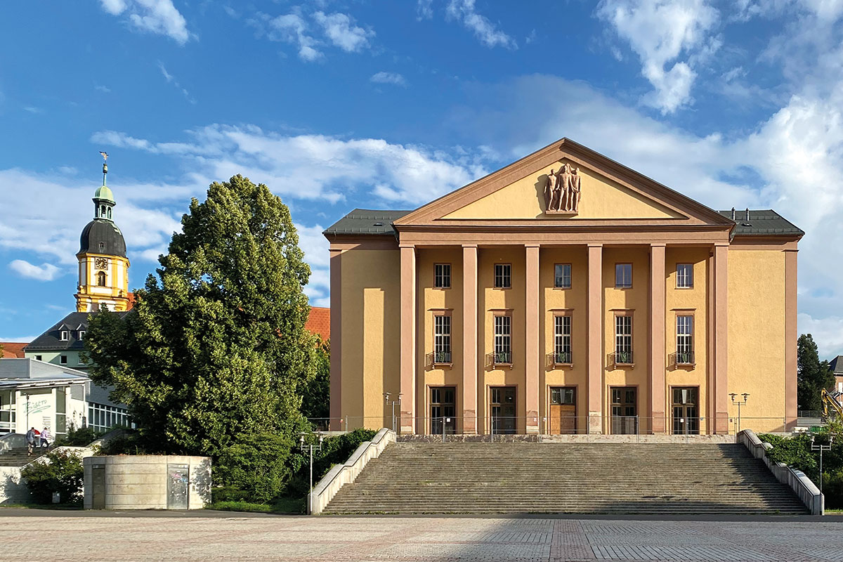 Saniertes Portalgebäude des ehemaligen Kulturhauses Suhl, September 2021 (Foto: Manuela Hahnebach)