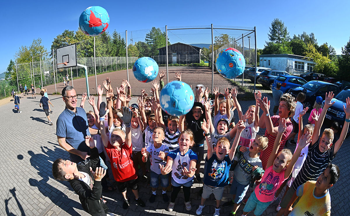 „Wir haben das sehr gerne getan, auf Lotto-Mittel haben wir leider keinen Zugriff“, sagte Freie-Wähler-Stadtrat Frank Keiner bei der Übergabe auf dem Schulhof der GS Suhl-Nord. „Wir wollen nicht nur vom fairen Handel und Unterstützung der Produzenten in armen Ländern reden, sondern auch etwas dafür tun“, führte er an. „Und was bietet einen besseren Anlass als die gegenwärtige Fair-Trade-Woche, das 25-jährige Jubiläum des Suhler Welt-Ladens und der Weltkindertag?“ Annette Kelber, Schulleiterin der GS Suhl-Nord, freute sich mit ihren Schülern über das Geschenk: „Viele unserer 173 Kinder, darunter 58 aus unterschiedlichen Ländern, sind sportlich interessiert und außerhalb der Schule in Vereinen unterwegs. Bewegung ist also in den Pausen und im Hort angesagt“, sieht sie beste Verwendung für die blauen Bälle mit den Ländern der Welt darauf.