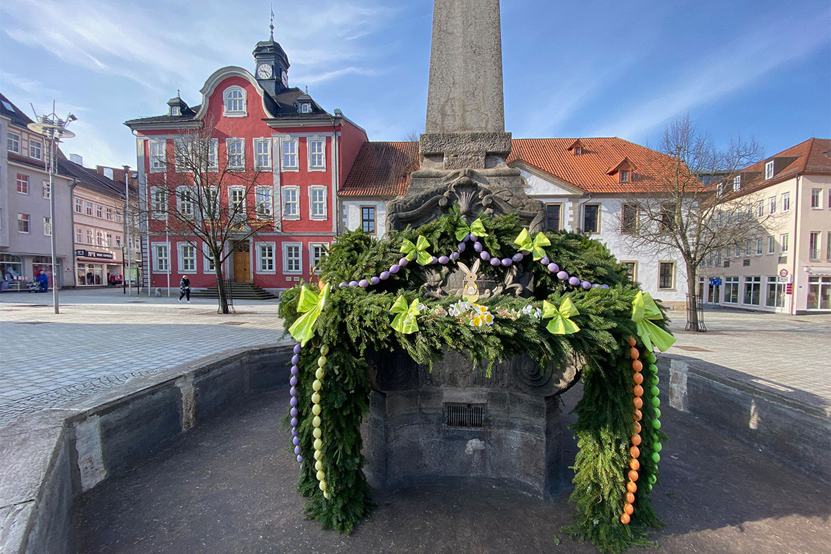 Wir Freien Wähler haben ihn geputzt, den Waffenschmied-Brunnen auf dem Suhler Marktplatz – wie alle Jahre zur Osterzeit. Viele haben erneut dazu beigetragen, dass der Marktplatz nun wieder einen bunten Mittelpunkt hat. Vor allem unser Vorstandsmitglied Sylvia Hammatschek ist mit Einsatz und Ideen nicht zu überbieten. Wer könnte auch sonst das Gestell so schön mit Tannengrün umwinden, dass es aussieht als ob eine Krone aus dem Brunnenbecken wächst? Unterstützung findet Sylvia auch bei ihren Freundinnen und Freunden aus Vesser. Keine versteht sich so aufs Schleifenbinden wie Pia! Natürlich sind auch wir Suhler Vereinsmitglieder nicht untätig. Unser Dr. Jens Triebel fällte zum Beispiel im Garten der Fraktionsvorsitzenden Ingrid eigens eine Fichte, deren frisches Grün vor Ort im Garten gleich fachgerecht geschnippelt wurde. Natürlich rechtzeitig vor dem 1. März! Das Aufstellen der Krone und das Aufhängen der Eierketten, das Platzieren von Frühlingsblüten und Häschen im frischen Grün war dann natürlich der sichtbare Höhepunkt.