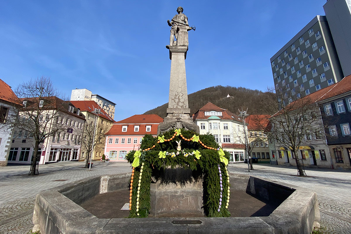 Freie Wähler Suhl schmückten den Waffenschmiedbrunnen am Marktplatz osterbunt (Foto: Andreas Kuhrt)