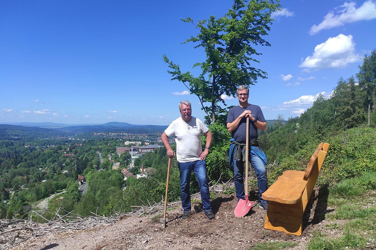 Bänke für Suhl: Hermann Klett und Frank Keiner stellen eine Rastbank auf