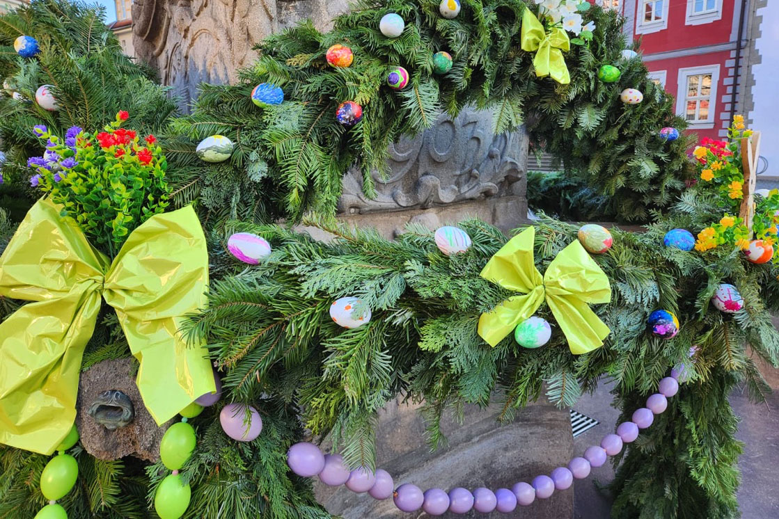 Waffenschmiedbrunnen Suhl im Osterkleid 2026 (Foto: Ingrid Ehrhardt)